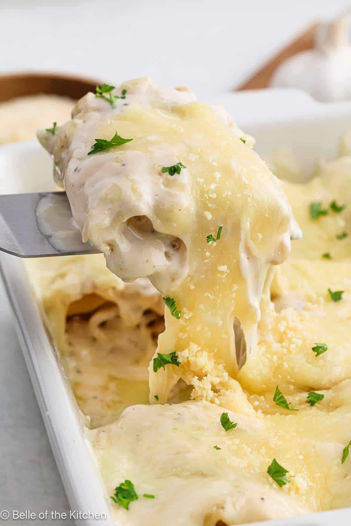 - Spread out cooked lasagna noodles on a clean, flat surface (I used a cutting board). Spoon 1 heaping tablespoon of ricotta mixture down the center of each noodle. Sprinkle with chicken, then top with a drizzle of Alfredo sauce, about 1 tablespoon for each noodle. Roll up each noodle, then place seam side down in prepared baking dish. Top with remaining Alfredo sauce then sprinkle with mozzarella and remaining 1/4 cup of parmesan cheese.