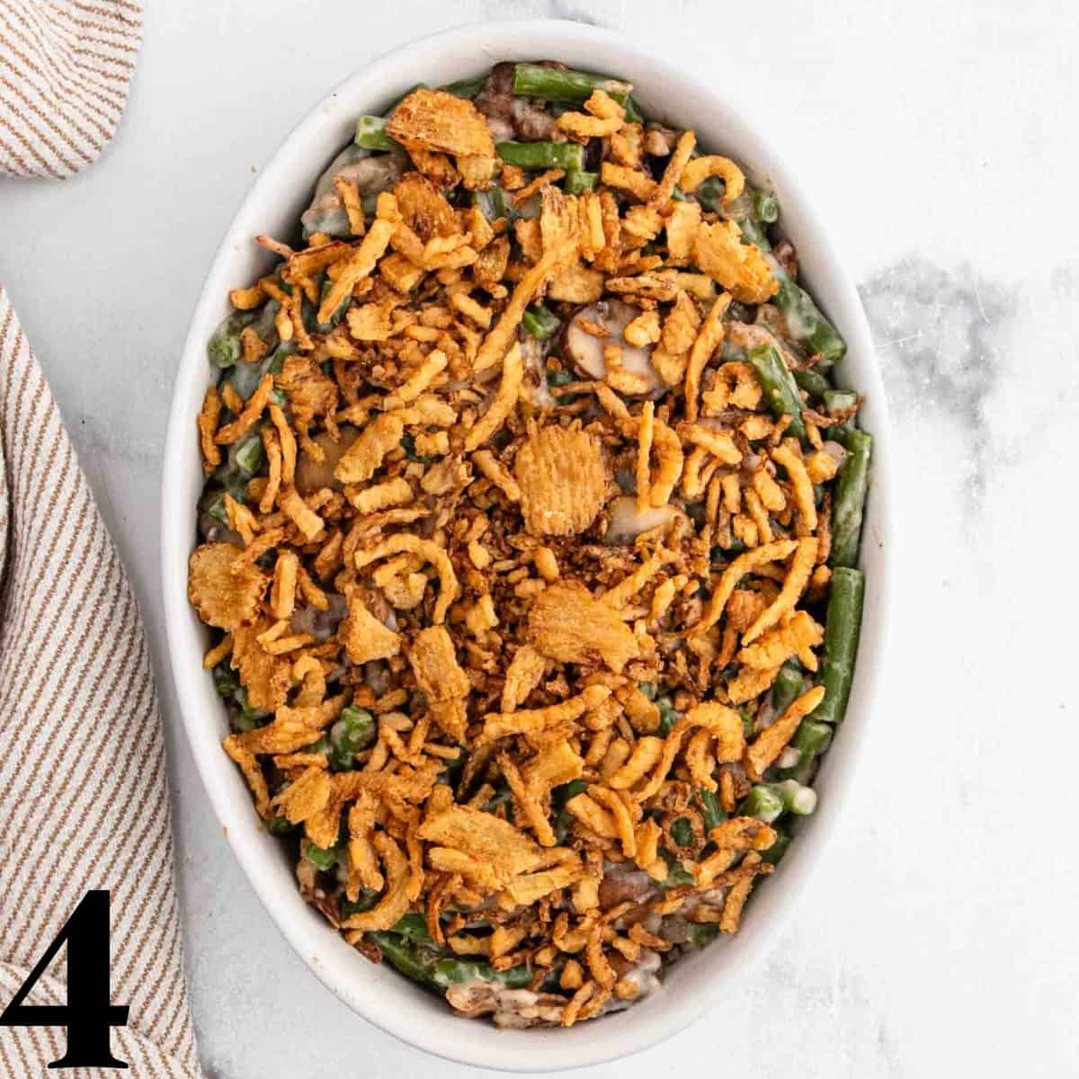 Pour the green bean mixture into the prepared casserole dish, spreading evenly. Top with the remaining fried onions and bake for 20-25 minutes, until the casserole is bubbly and the crispy onions are golden brown.