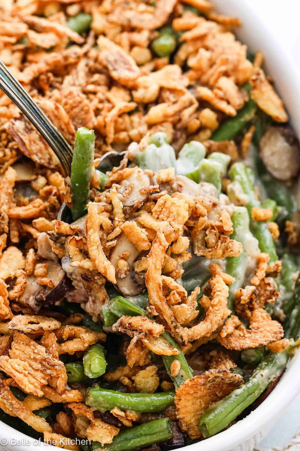 - French fried onions – gives a little crunch to your fresh green bean casserole. I like to mix some into the casserole and then top it off with the rest.