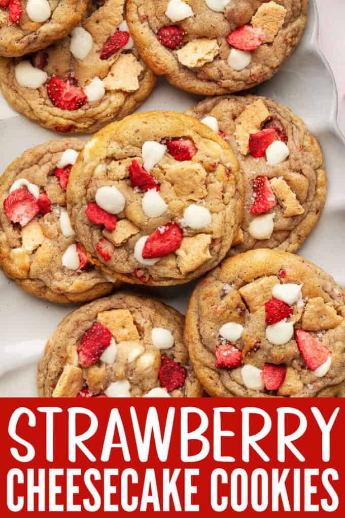 These chewy cookies have a similar flavor base to my Cream Cheese Chocolate Chip Cookies, with their soft texture and rich flavor that comes from the addition of the cream cheese. But for this version, I’ve added in white chocolate chips, graham cracker crumbs, and freeze-dried strawberries for a fun twist. These have all the strawberry cheesecake flavors you love, but in cookie form!